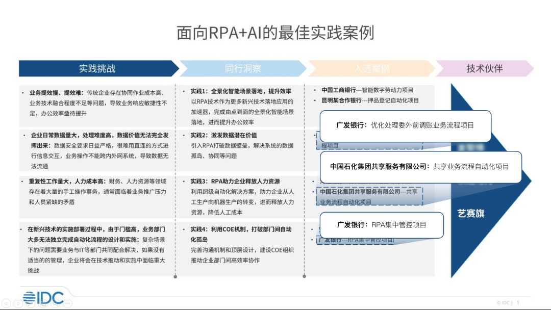 Recently, IDC released the "RPA+AI Best Practice Cases" report, summarizing the challenges and practical paths faced by industry users in the application process, and selecting the best practice cases for market reference.