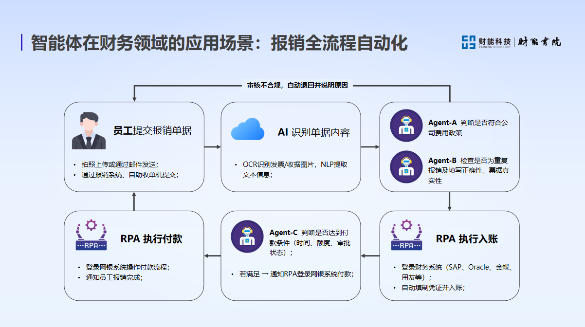 In terms of specific application scenarios, intelligent agents have demonstrated strong capabilities in the automation of the entire reimbursement process, market trends and financial risk prediction, cash flow prediction and dynamic scheduling, accounts receivable management and collection, internal audit, and regulatory response and compliance execution.