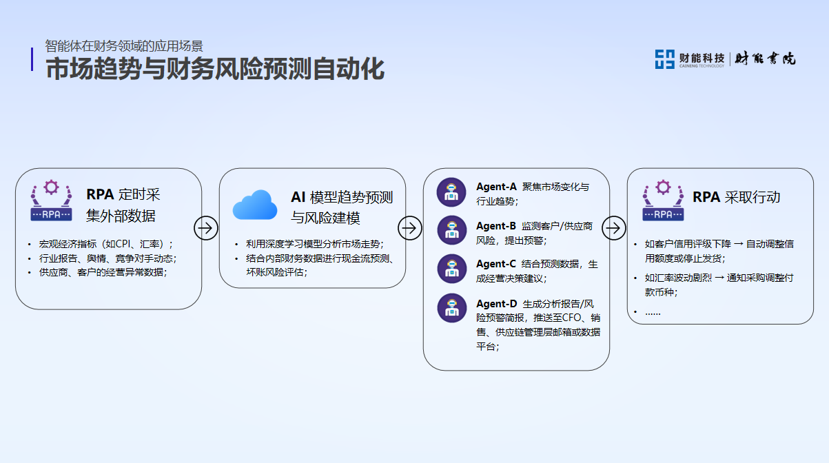 In the automation of market trends and financial risk prediction, intelligent agents use deep learning models to analyze market trends, combine internal financial data for cash flow prediction and bad debt risk assessment. For example, if a customer's credit rating is taken down, RPA will be triggered to automatically adjust credit limits or stop shipments; If the exchange rate fluctuates sharply, trigger RPA to notify the procurement to adjust the payment currency in a timely manner.