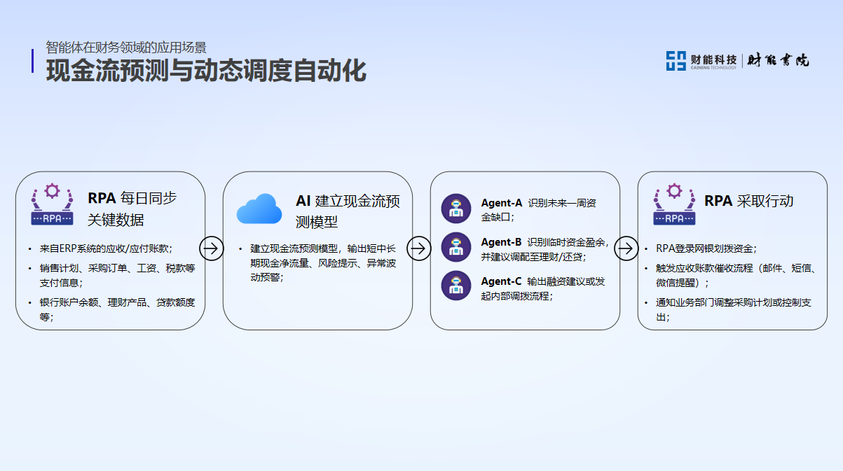 In cash flow forecasting and dynamic scheduling automation, if an intelligent agent identifies temporary surplus funds, it can provide suggestions for allocating them to financial management or repayment, triggering RPA to execute operations such as fund transfer and accounts receivable collection.