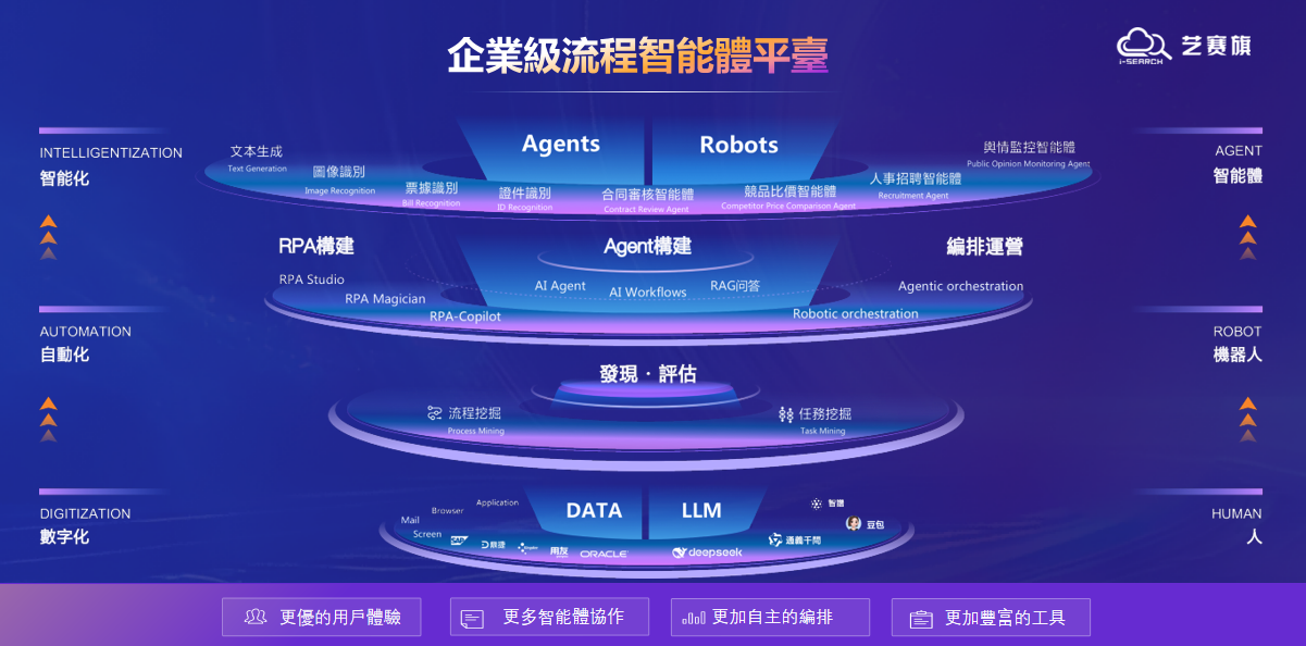 In response to the various challenges in the implementation of hyper automation, I-Search has integrated AI big models with products such as iS-RPA (Robot Process Automation) and iS-RPM (Process Mining), and launched a new iS Agent (Enterprise level Intelligent Agent) this year to build an enterprise level process intelligent agent platform.