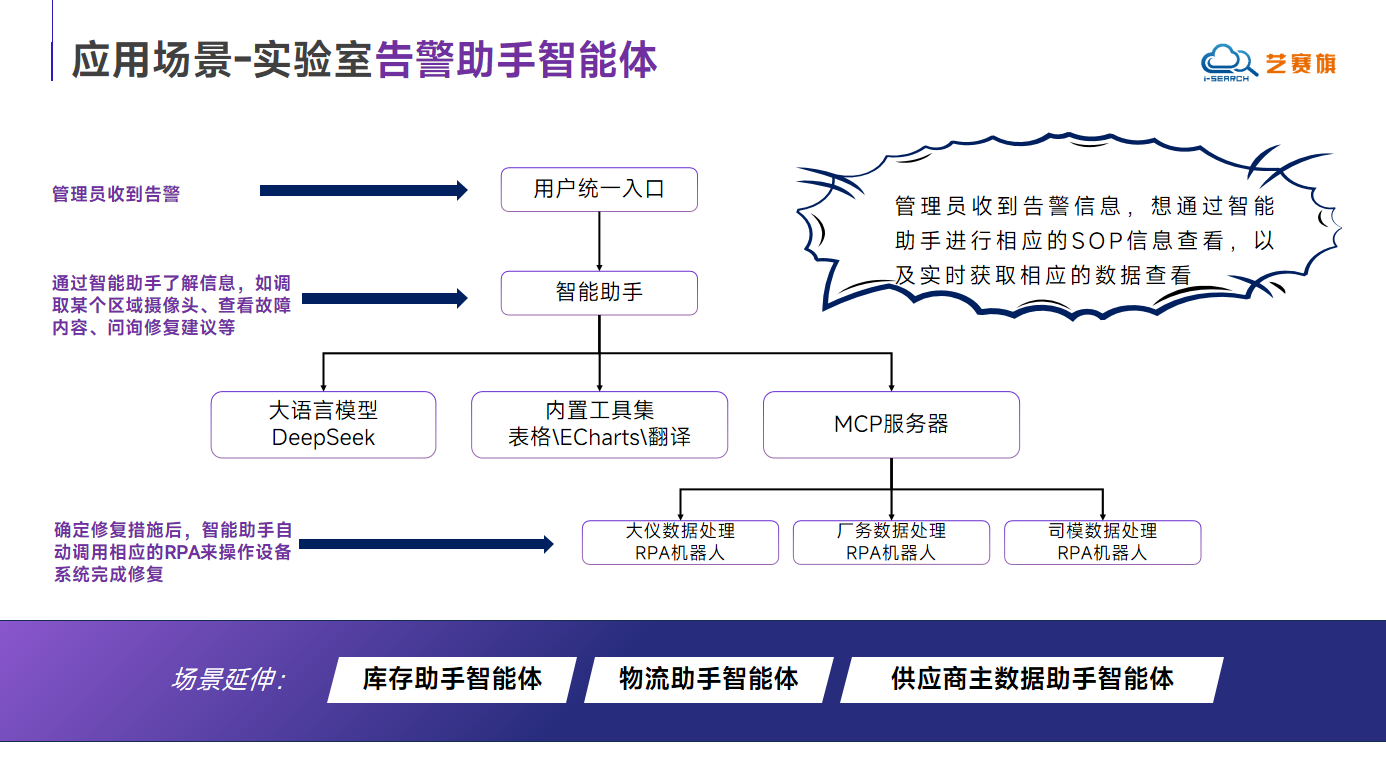 I-Search showcased multiple practical application cases. For example, administrators can obtain information through the laboratory alarm assistant intelligent agent, including calling specific area cameras, viewing fault details, etc. After determining the repair plan, the intelligent assistant can automatically call the corresponding RPA process, and the operating device system completes the repair. Based on this mode, multiple application scenarios such as "inventory assistant agent", "logistics assistant agent" and "supplier master data assistant agent" can also be expanded.