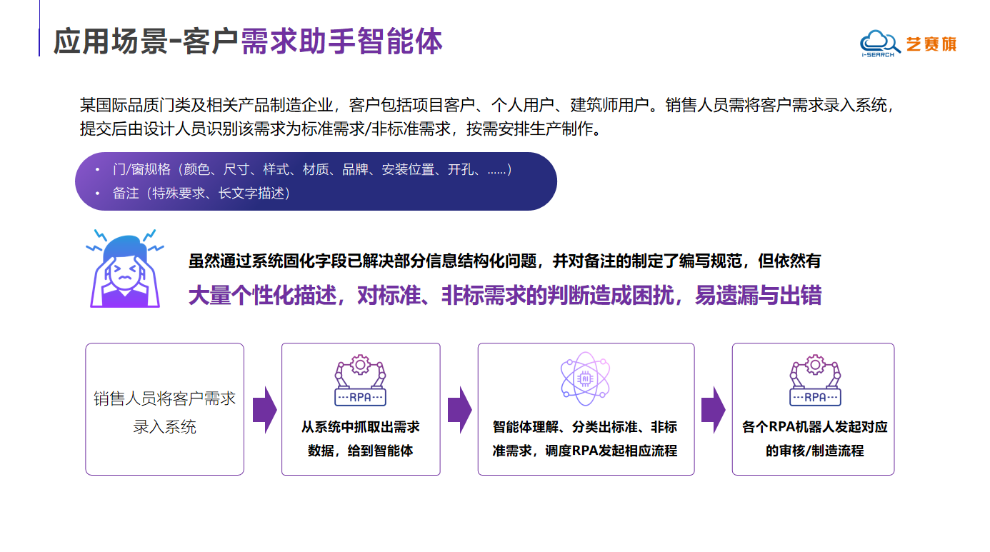 A well-known international category and supporting product manufacturing enterprise is facing the challenge of demand classification in the sales process. Sales personnel need to input customer requirements into the system, and designers need to determine whether the requirements belong to standard or non-standard requirements in order to arrange corresponding production plans. Due to the diverse types of customer needs, although the enterprise has achieved structured processing of some information through system preset fields and formulated note filling standards, there are still a large number of personalized descriptions, which make it difficult to judge standard and non-standard requirements, and are prone to omissions and errors. To solve this problem, the customer requirement assistant intelligent agent can automatically identify and classify standard and non-standard requirements, and trigger corresponding business processes through RPA technology.