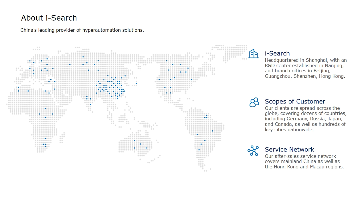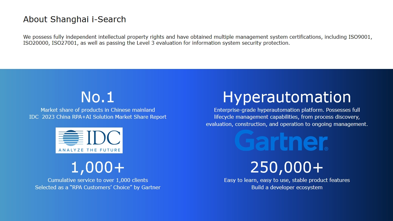 Industry analysts recognize iSearch's unique positioning in "agentic process automation" - bridging RPA's execution strength with LLMs' cognitive flexibility. Their solutions currently process over 200 million monthly transactions for clients like ICBC and SAIC Motor, achieving 40-65% operational cost reduction.