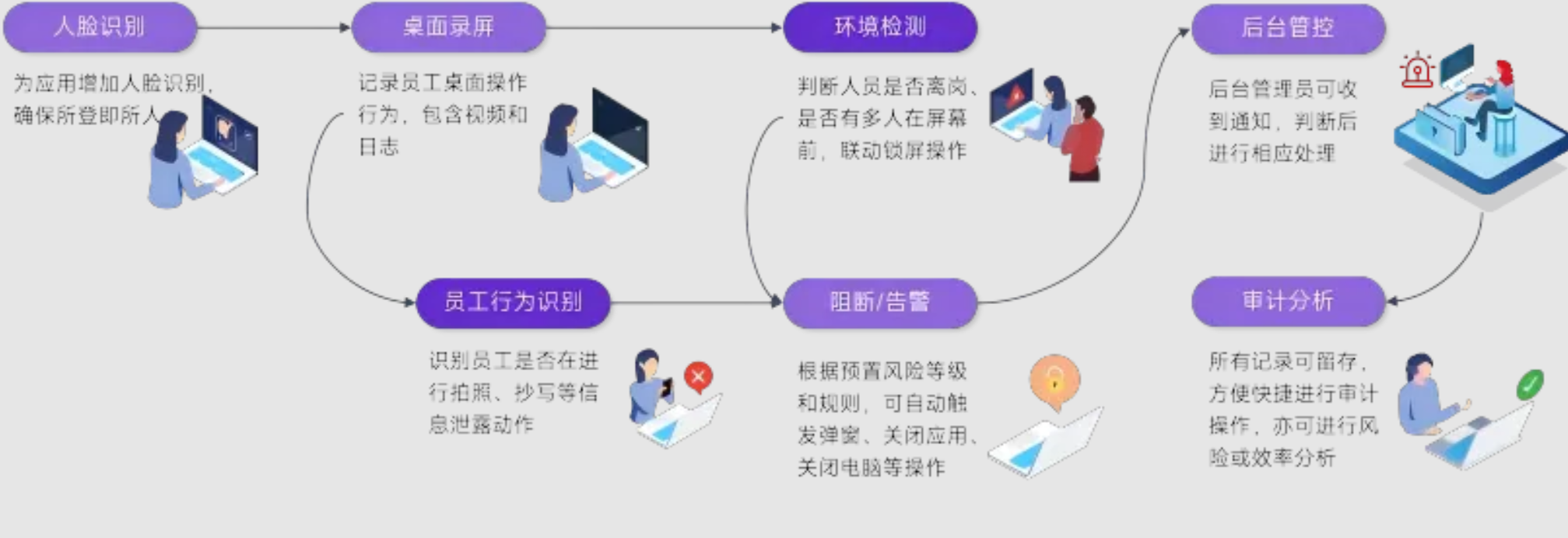 The whole process behavior monitoring uses the camera to record the human behavior of employees when operating sensitive applications/Web pages, and automatically identify high-risk operations such as mobile phone shooting, copying, multiple people in the same frame, and leaving the post.
